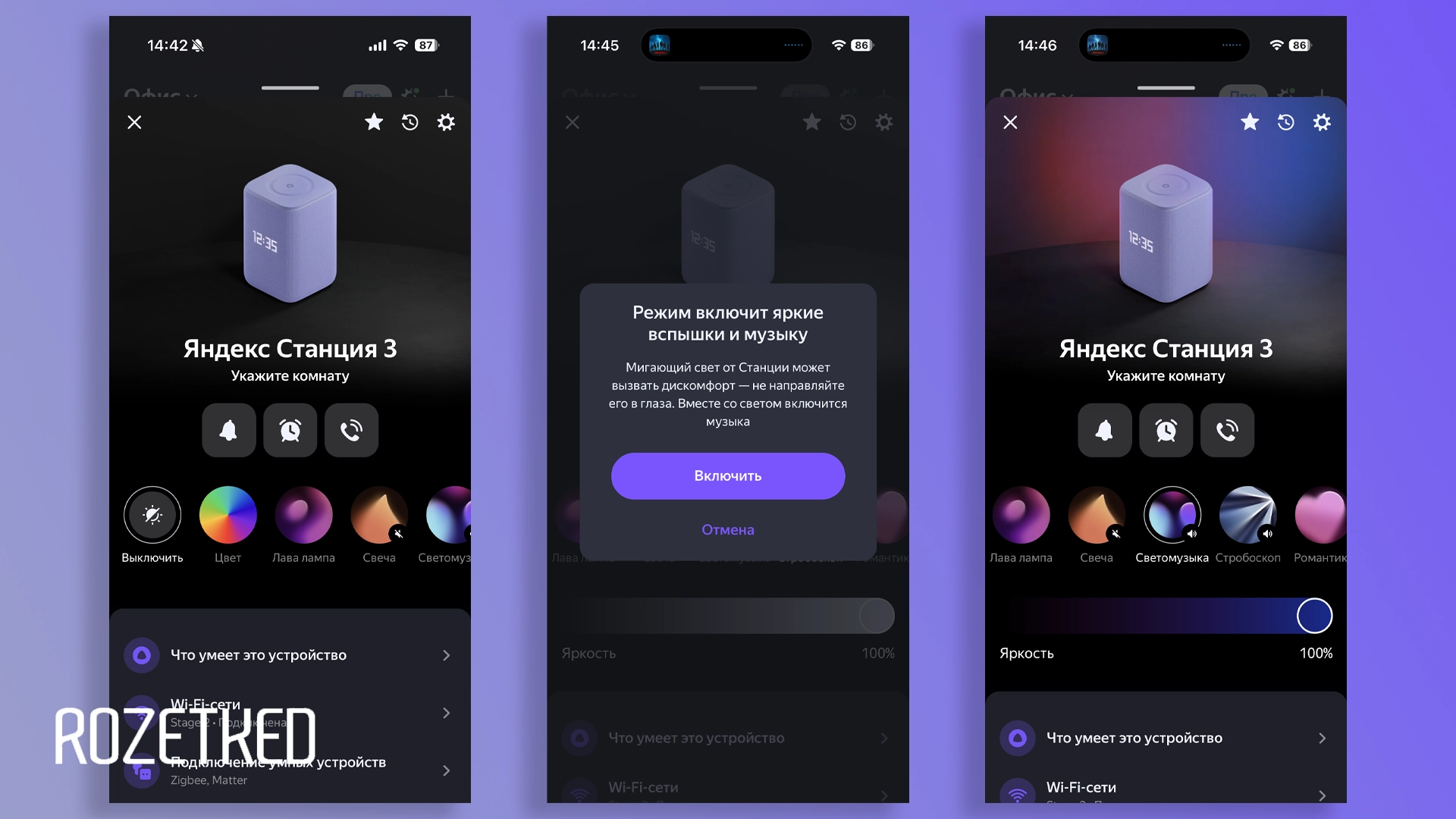 Музыкальные пресеты работают только с музыкой, которую включила «Алиса» из «Яндекс Музыки»; в режиме Bluetooth светомузыка недоступна, так что имейте в виду.