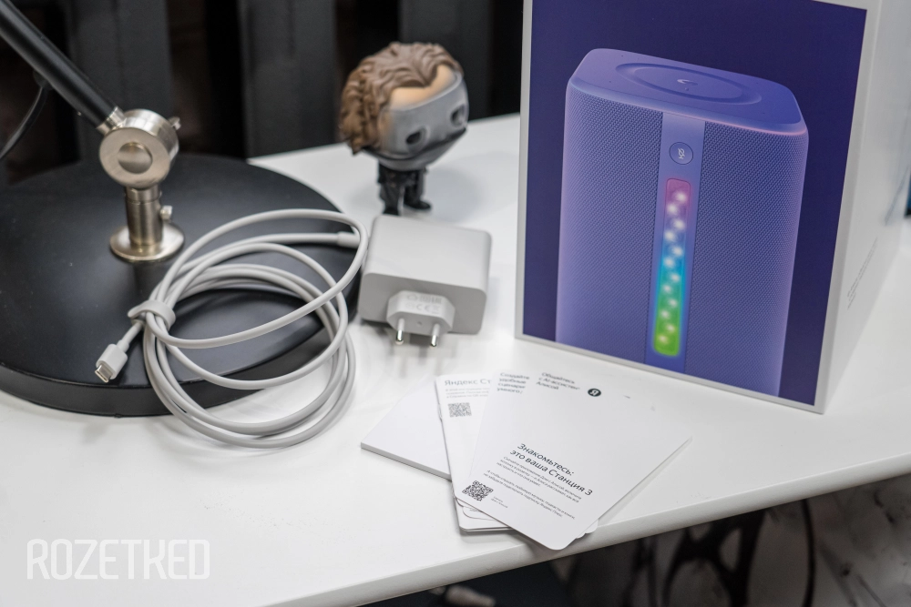 По комплектации всё стандартно. Умная колонка — это не то устройство, где ждёшь интересных дополнений в коробке. Как и всегда, в комплект кладут саму «Станцию», инструкцию, адаптер и кабель с двух концов Type-C. Лучше использовать именно комплектный адаптер, чтобы колонке точно хватило питания.