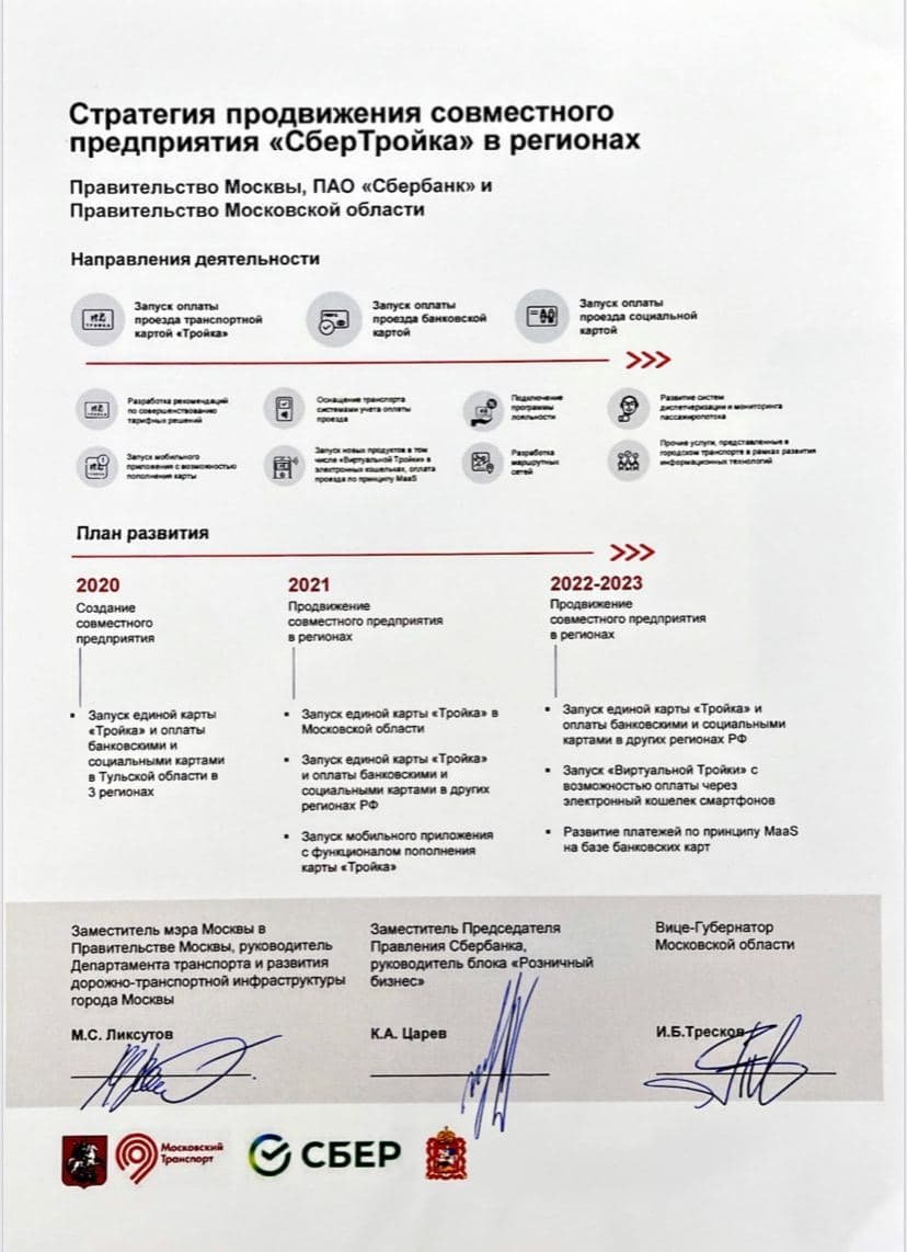 18 ноября мэрия Москвы, правительство Подмосковья и «Сбер» подписали стратегию развития единой транспортной карты в российских регионах, — сказано в официальном Telegram-канале Дептранса Москвы.