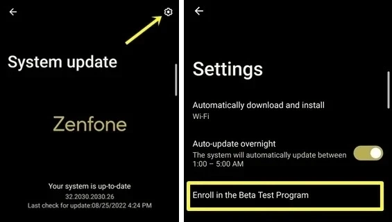 Если у вас Zenfone 9, то необходимо пройти в раздел «Обновление системы» и нажать на шестерёнку в правом верхнем углу. Там выбрать пункт «Зарегистрироваться в программе бета-тестирования», согласиться с правилами участия и заполнить анкету-заявку через профиль пользователя Asus.