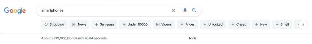 Вместо привычных вкладок «Новости», «Картинки», «Карты», «Видео» и др. на этом месте располагаются подсказки к текущему запросу исходя из контекста. Например, если «загуглить» слово «смартфоны», в небольших карточках предлагается добавить к запросу фрагменты «до 300 долларов» или «Samsung». Предложения перейти к вкладкам встречаются в этой же панели, но они не имеют фиксированного места отображения — иногда до нужного раздела приходится листать меню.