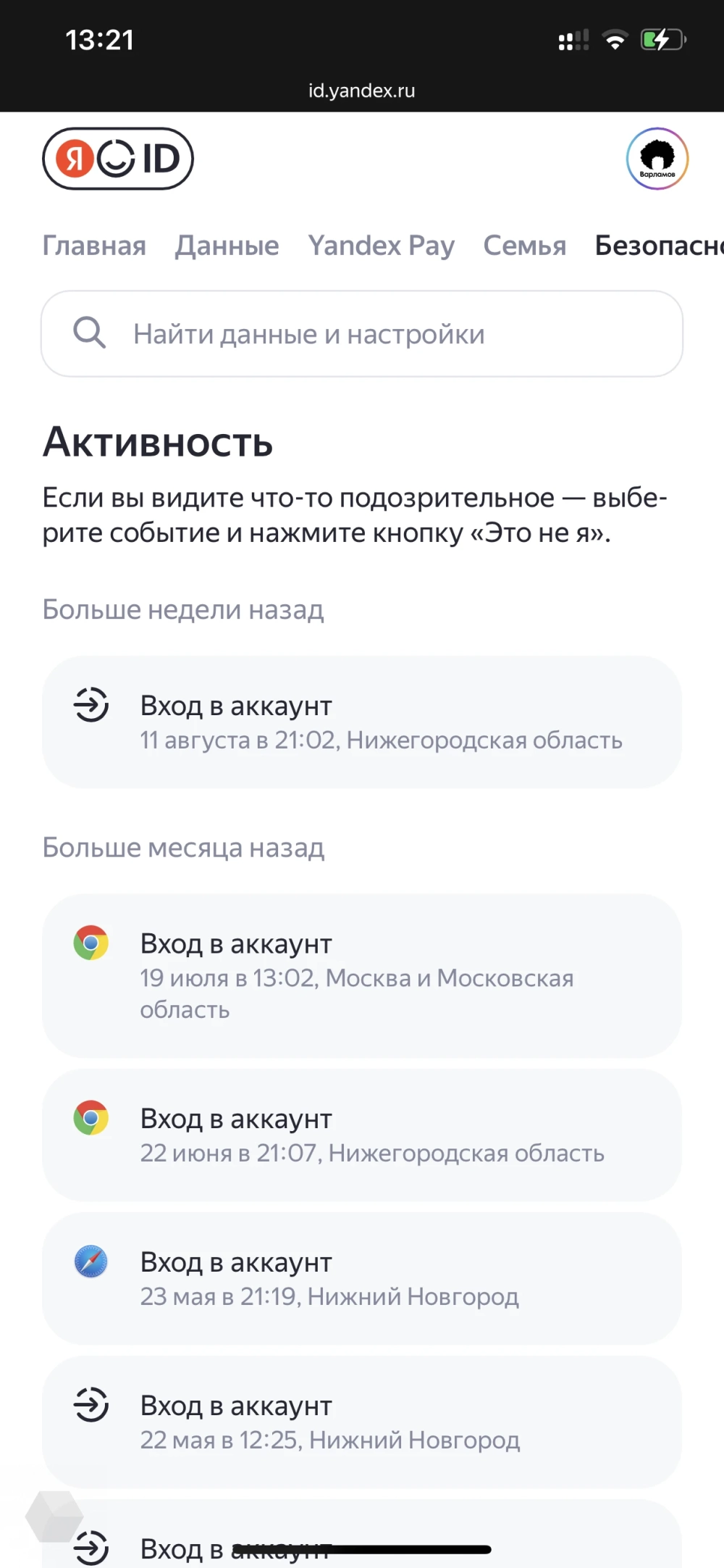 Раздел Yandex Pay содержит всю платёжную информацию, включая электронные чеки, привязанные карты, баллы «Плюса» и историю покупок. Всё о защите аккаунта собрано в «Безопасности» — там же можно изменить пароль, способы авторизации и многое другое.