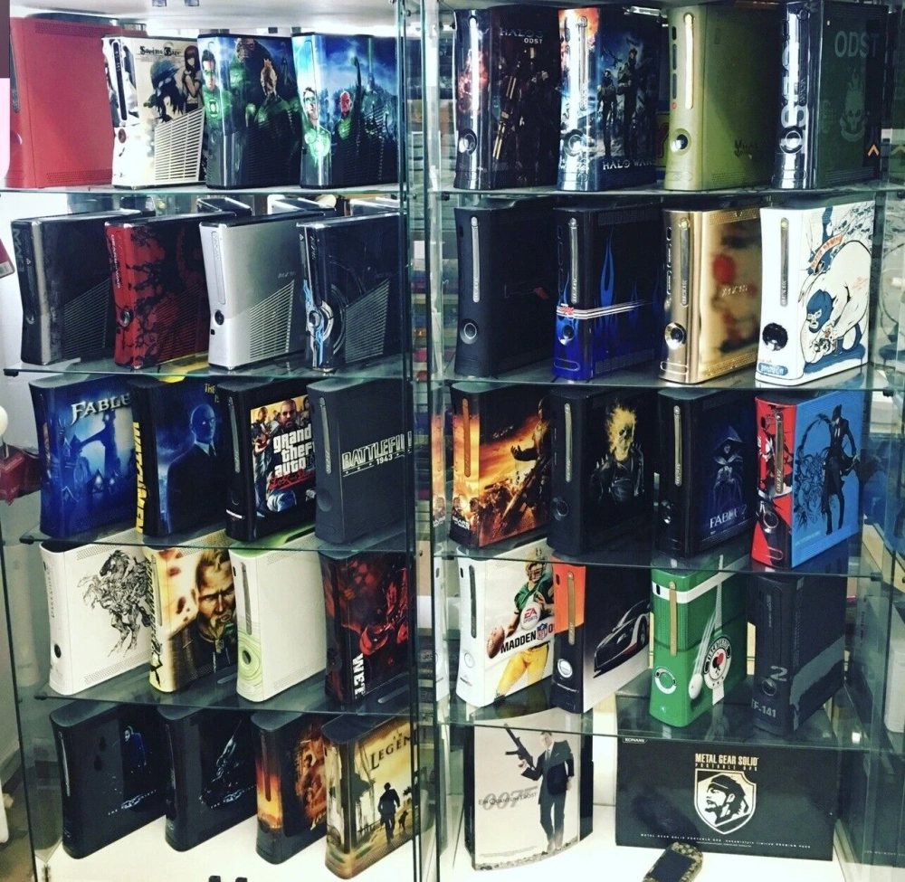 Судя по фото, одних только тематических Xbox 360 в коллекции несколько десятков. Также на полках можно увидеть разные версии Game Boy, Nintendo 64 и GameCube, а также первый Xbox, TurboGrafx-16 и многое другое.