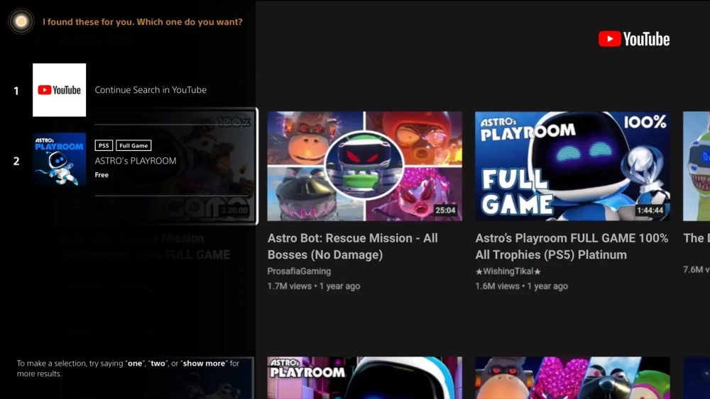 Также обновление добавило возможность искать контент на YouTube с помощью голосового управления. Из любого места на PS5, в том числе во время игры, пользователь может сказать: «Привет, PlayStation, найди что-то на YouTube». Приложение YouTube откроется, и будут показаны соответствующие результаты поиска. Эта функция пока находится на этапе тестирования и доступна только на английском языке для учетных записей в США и Великобритании.