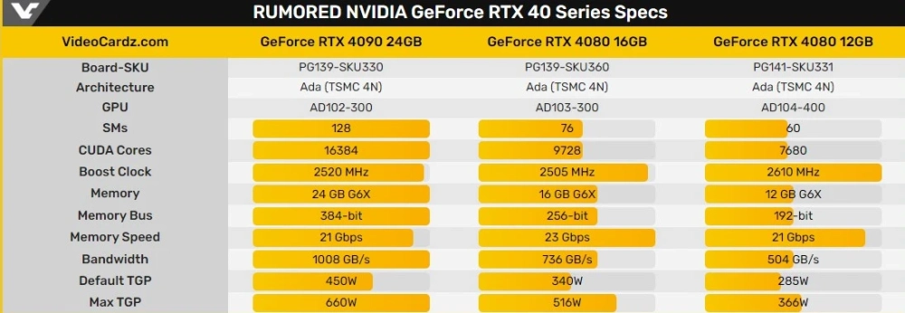 Портал VideoCardz со ссылкой на свои источники и инсайдеров опубликовал все характеристики грядущих видеокарт GeForce RTX 4090/4080.