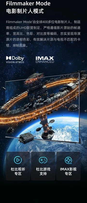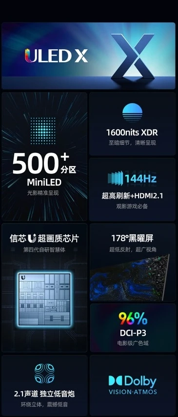 Разрешение экрана — 4K (3840×2160 пикселей). Телевизор поддерживает частоту обновления 144 Гц и выдаёт яркость до 1600 нит. Есть поддержка HDR, VRR (переменная частота обновления) и Dolby Vision. Для панели заявлены углы обзора в 178° и покрытие гаммы DCI-P3 в 96%.