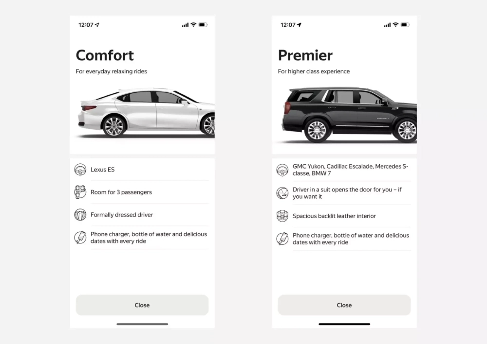 На данный момент клиентам в Дубае доступен только заказ такси, но в будущем компания может добавить и другие сервисы. Для заказа доступны машины классов «Комфорт» и Premier. Это автомобили Lexus ES, GMC Yukon, Cadillac Escalade, Mercedes S и BMW 7.