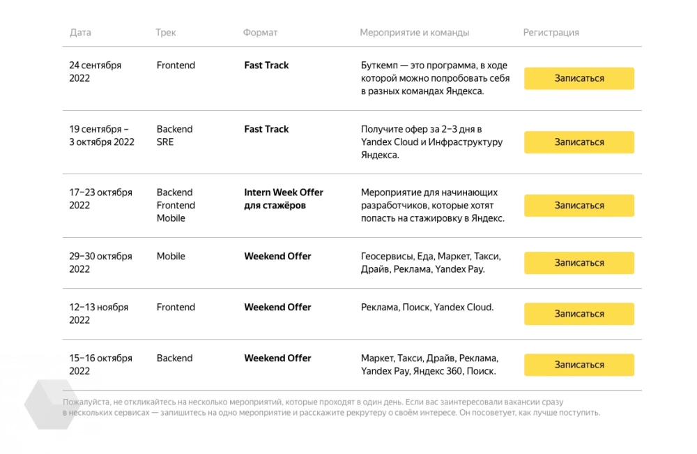 Сейчас в нём доступны три вида событий, в рамках которых специалисты могут получить оффер от одного дня.
