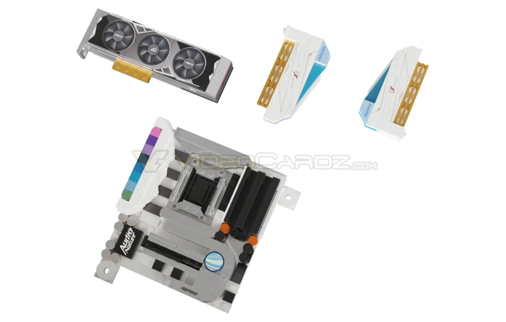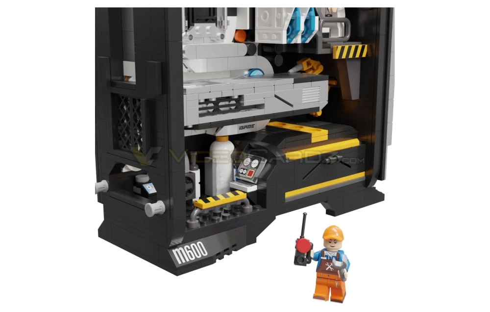 Внутри «компьютера» также стоят копии материнской платы Colorful iGame UltraD5 Z690 и планок оперативной памяти Colorful iGame Vulcan DDR4. Импровизированный ПК нужно собирать самому — получается своего рода конструктор LEGO для поклонников компьютерной тематики. Всего набор, созданный Pingqui Building Blocks, состоит из 1123 деталей. Также в комплекте идут две фигурки инженеров.