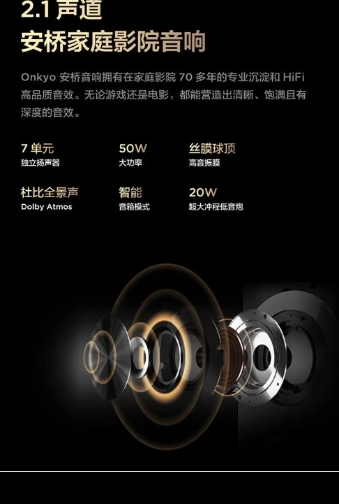 В наличии 2.1-канальная аудиосистема Onkyo мощностью 50 Вт с Dolby Atmos, три порта HDMI 2.1, поддержка переменной частоты обновления (VRR) и автоматического режима низкой задержки (ALLM), а также Wi-Fi 6.
