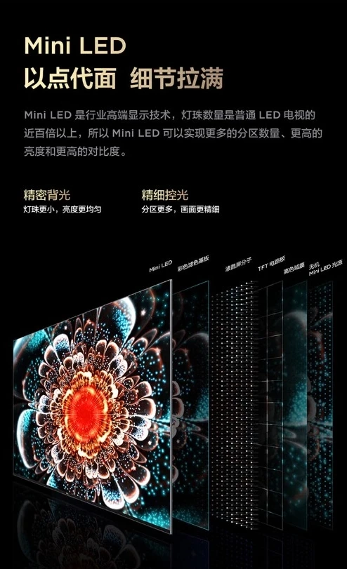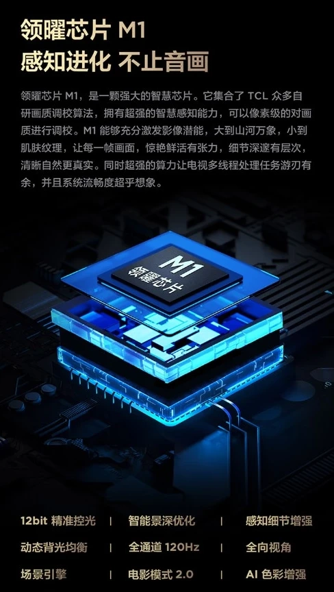 Экран способен отображать 1,07 млрд цветов и покрывает 95% цветовой гаммы DCI-P3. Внутри стоит 4-ядерный процессор M1 (к Apple не имеет никакого отношения) с графикой Mali-G52 MP2. Также на борту есть 4 ГБ оперативной памяти и 128 ГБ накопителя. Разрешение экрана — 4K. Телевизор поддерживает частоту обновления 120 Гц, Dolby Vision и IMAX Enhanced.