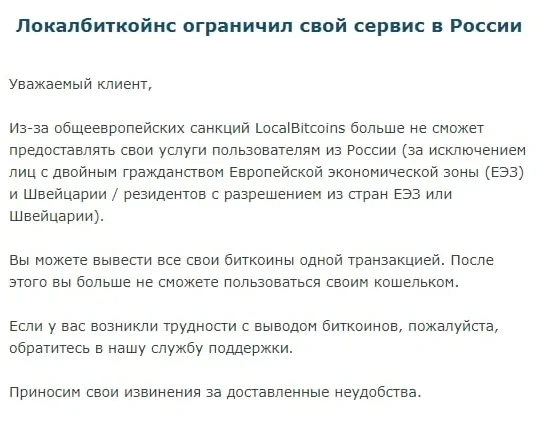 Платформа по обмену биткоинами LocalBitcoins уведомила российских пользователей о прекращении обслуживания их счетов. Соответствующие письма клиентам биржи присылают на почту.