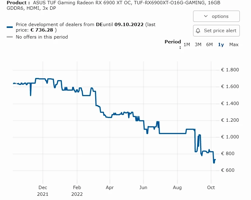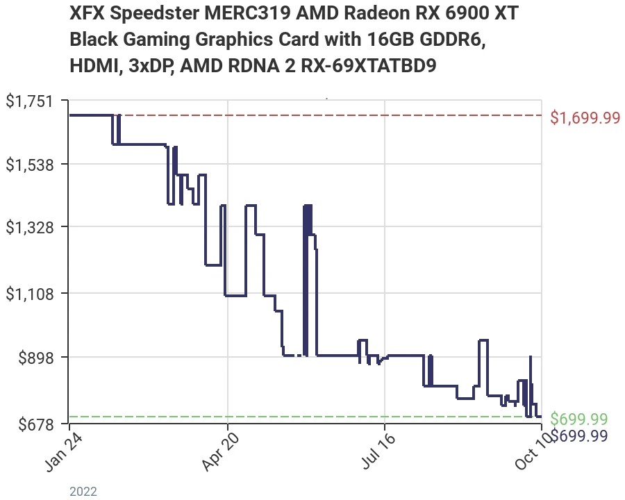 Radeon RX 6900 XT, которая была самой быстрой видеокартой в ассортименте AMD до выхода RX 6950 XT, опустилась в цене до самых низких значений за всё время. Об этом пишет портал Videocardz.