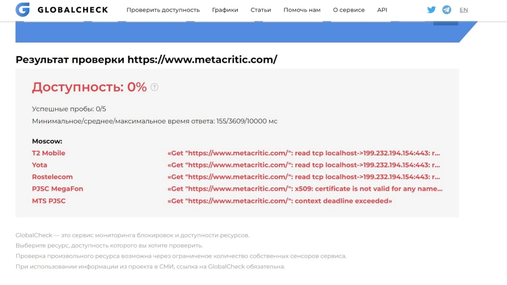 По данным сайта GlobalCheck, Metacritic недоступен у всех ведущих российских провайдеров. Открыть сайт агрегатора без VPN не получится.
