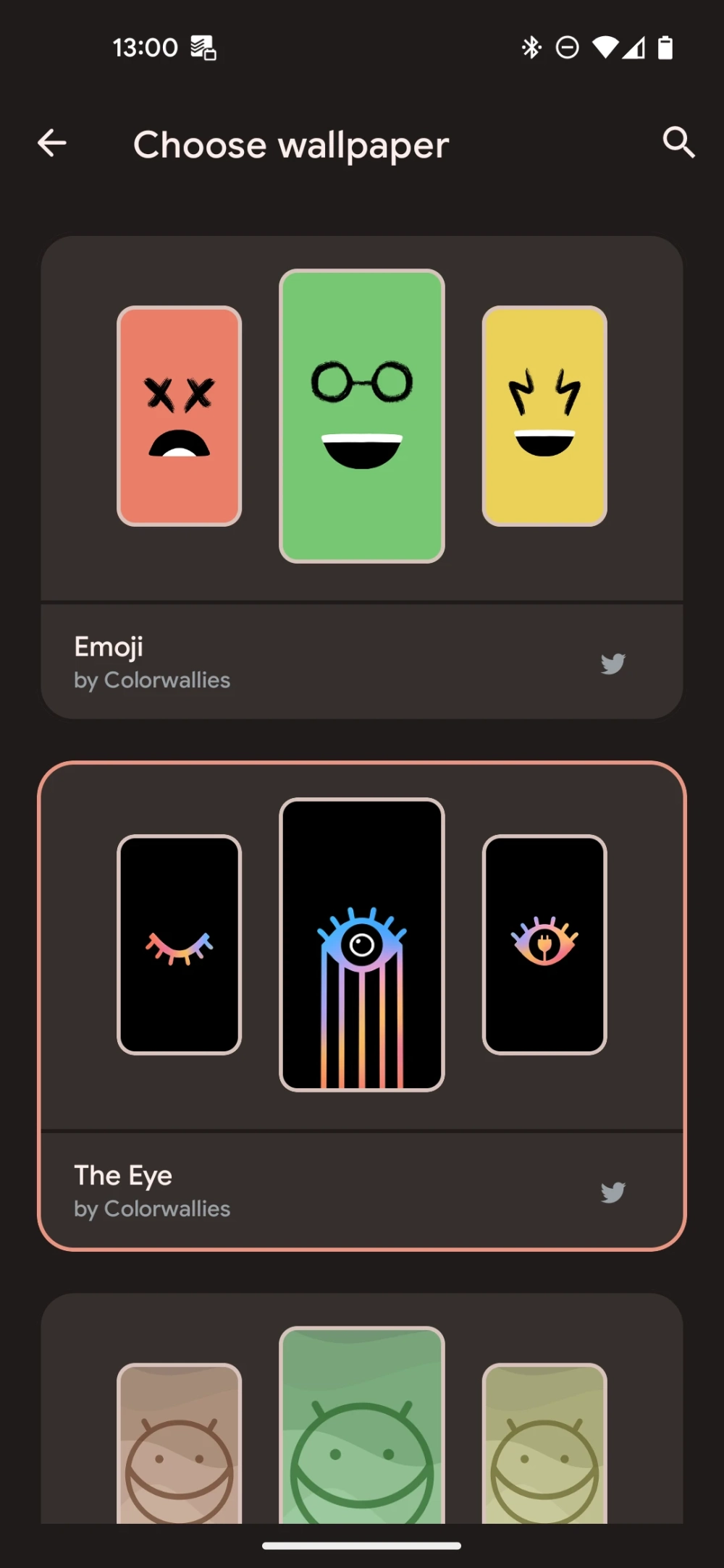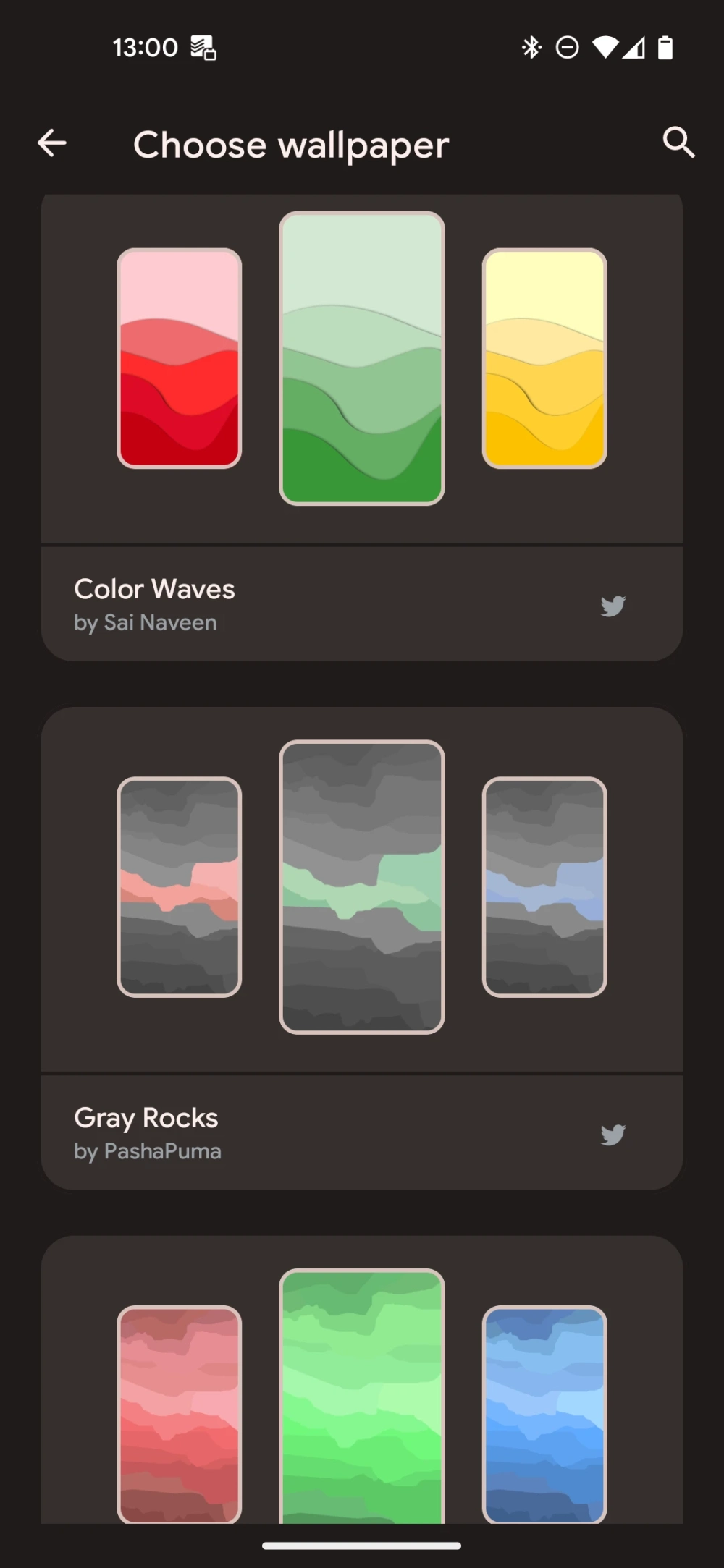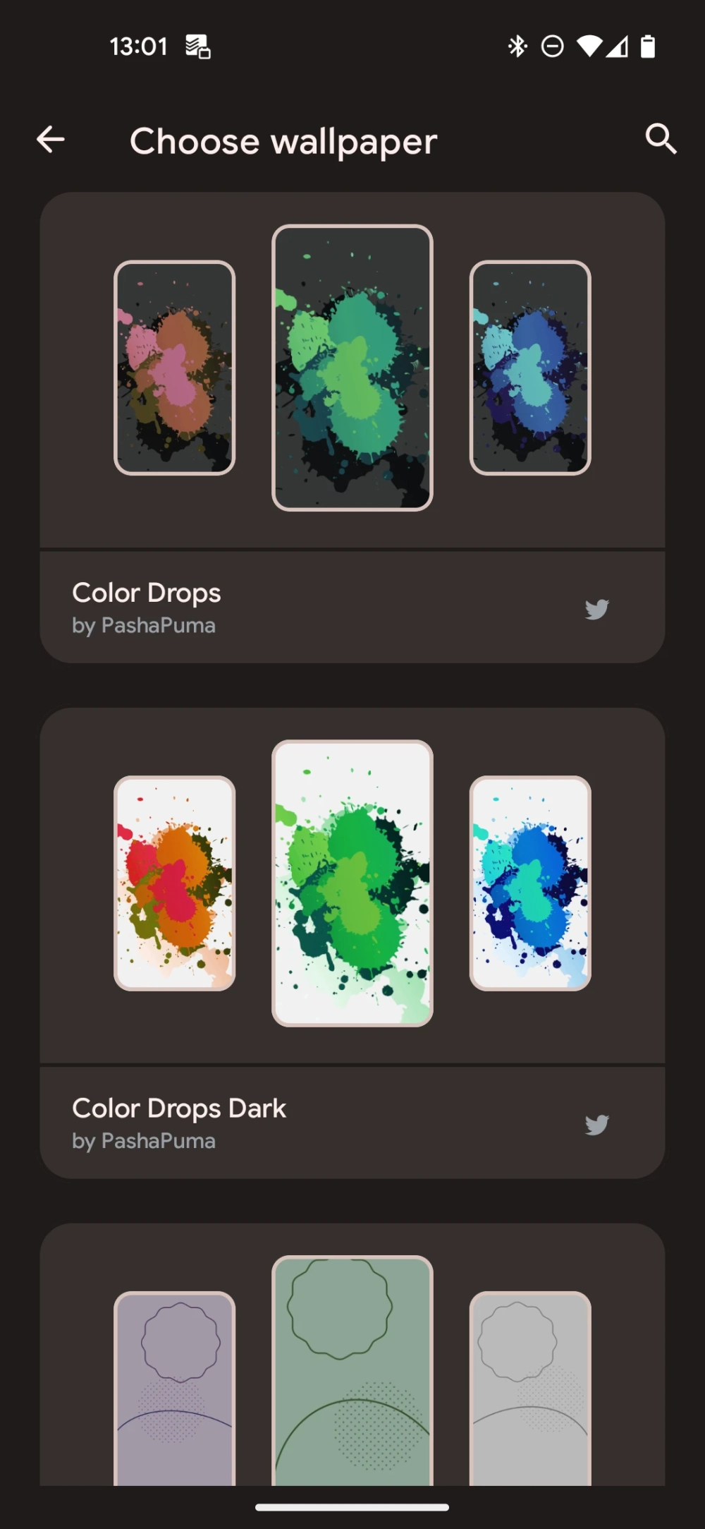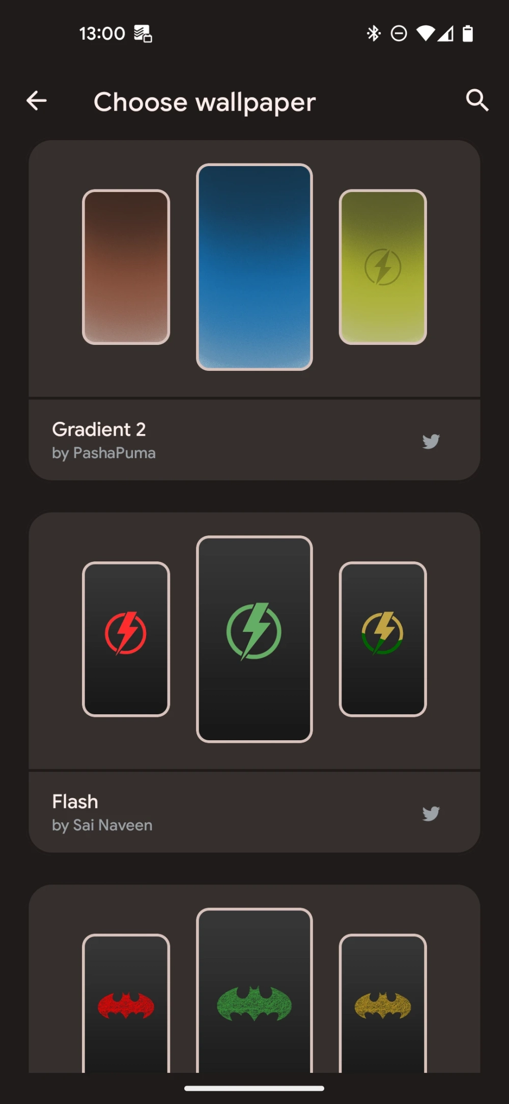В Dynamic Wallpaper предустановлены 17 наборов заставок от дизайнеров Pashapuma Design, Nayella и Sai Naveen. Среди них есть тематические: например, со значком Бэтмена или напоминающие стилистику Google Material You.