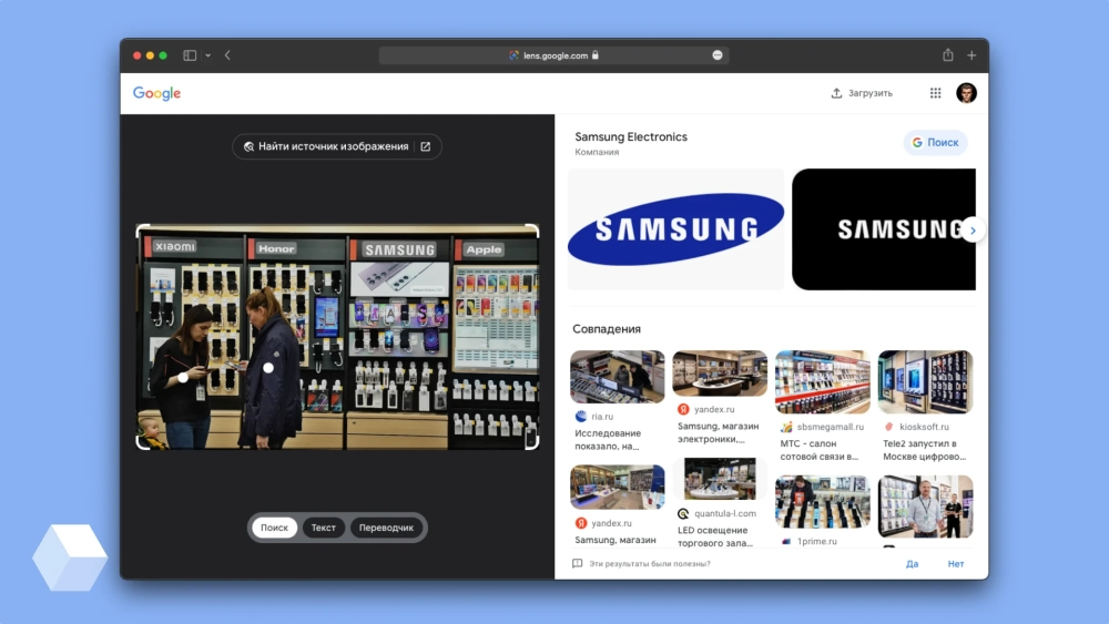 Нажав на кнопку «Поиск по картинке», появится окно для загрузки изображения напрямую или по ссылке. Сервис откроет страницу с информацией о картинке: обнаруженных на ней надписей, контекстную информацию о предмете, похожие иллюстрации. Также Google поможет найти источник изображения и перевести текст на нём.