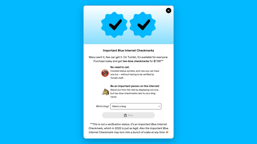 Так Tumblr решил подшутить над Twitter. Новая подписка Twitter Blue, помимо некоторых других фишек, подразумевает отметку для аккаунта в виде синей галочки. Раньше галочку нельзя было купить — её выдавали только важным персонам или официальным представительствам организаций.