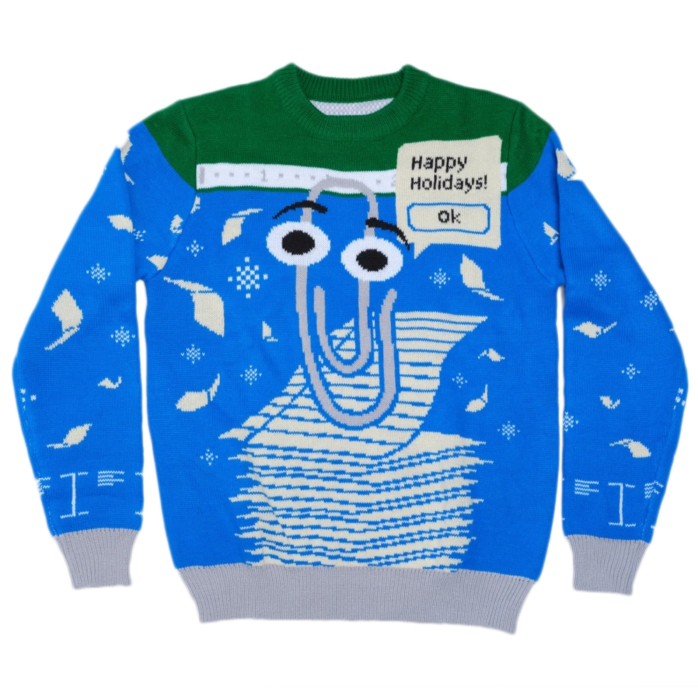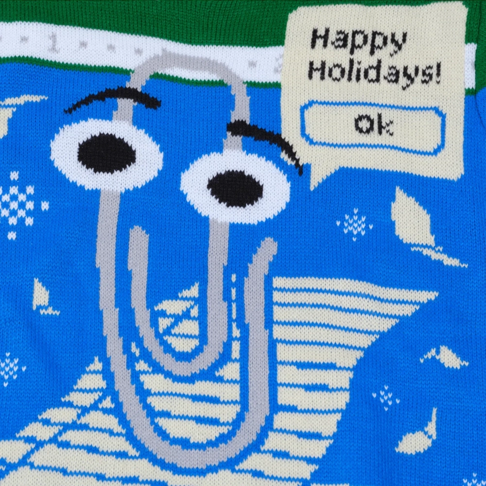 Компания Microsoft выпустила новый «уродливый» свитер. В этом году главной темой выбрали скрепку Clippy из Windows. Новинку назвали Windows Ugly Sweater: Clippy Edition.