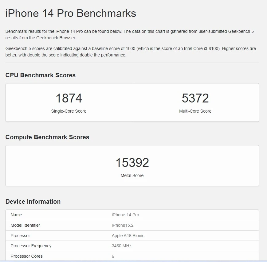 iPhone 14 Pro с Apple A16 показывает 1874 и 5372 балла.
