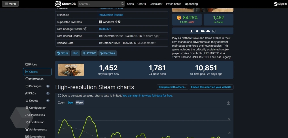 Дела у Miles Morales всё равно идут лучше, чем у Uncharted: The Legacy of Thieves Collection, пиковый онлайн которой с момента релиза не превысил 11 000 геймеров.