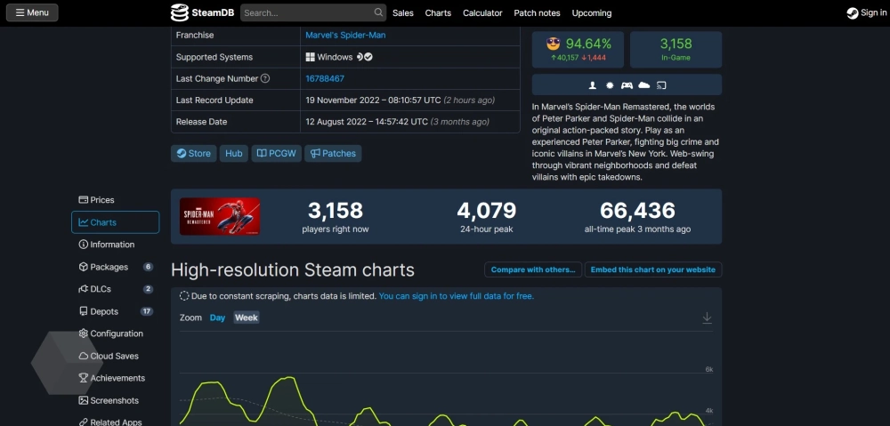 По данным SteamDB, на момент написания новости, пиковый онлайн Miles Morales в Steam составляет чуть больше 12 000 игроков. Для сравнения, в Marvel’s Spider-Man Remastered в лучшие времена играло более 66 000 геймеров, а на релизе — около 30 000.