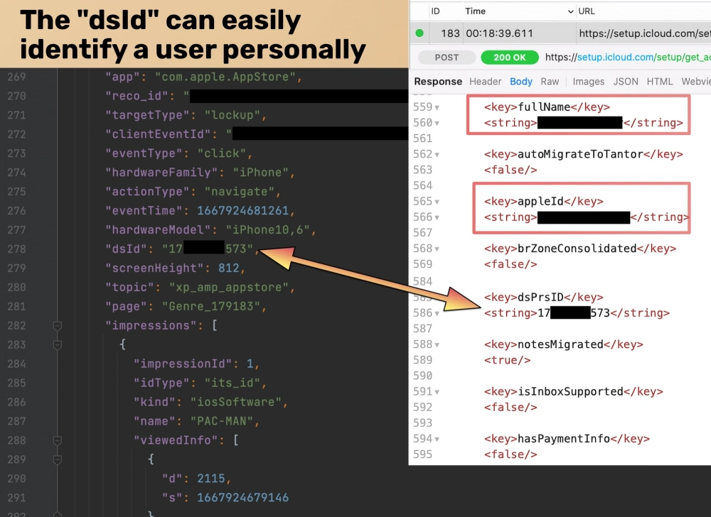 Как утверждают в Mysk, система аналитики передаёт параметр dsId (Directory Services Identifier, идентификатор службы каталогов). Анализ показал, что этот идентификатор уникален для каждого пользователя и может быть напрямую связан с определённой учётной записью iCloud, где хранятся имя, дата рождения, адрес электронной почты и другая информация о человеке.