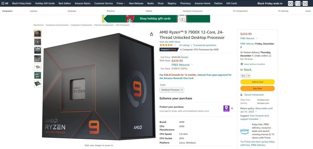 На Amazon появилось ещё более выгодное предложение — Ryzen 9 7900X продают за 439,99 долларов (~26 600 рублей). На это обратил внимание портал Tom’s Hardware.