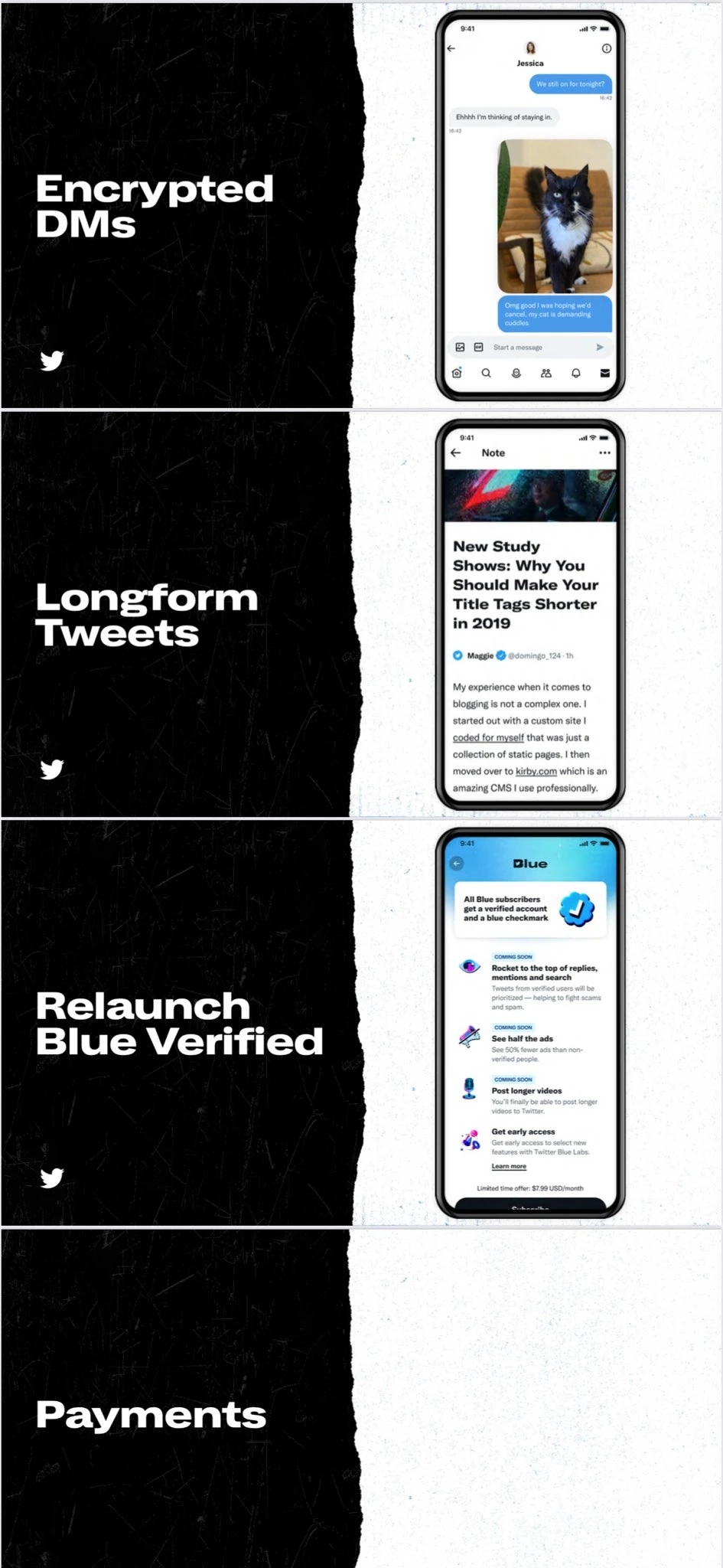 Ещё в «Twitter 2.0» появится возможность публикации длинных твитов (об этом сообщалось ранее), некие новые видеовозможности и изменения в системе платежей.