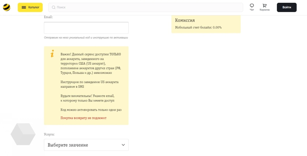 На сайте «Билайна» есть пометка, что комиссия за покупки составляет 0.00%. Правда некоторые ограничения всё равно имеются. Например, для пополнения того же PS Store необходим только американский аккаунт PSN (как его создать, читайте тут).