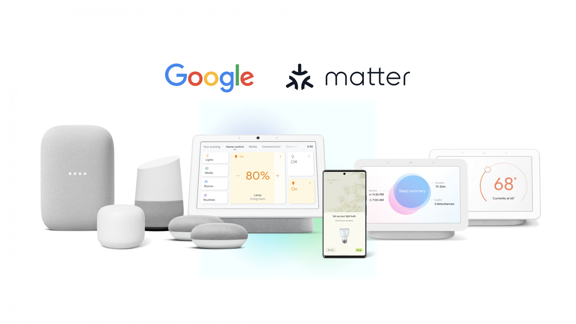 Для работы устройств умного дома по протоколу Matter необходима установка концентратора. Его роль могут выполнять Nest Audio, Nest Hub и Hub Max, Nest Mini, Google Home и Home Mini, а также роутер Nest Wifi Pro.