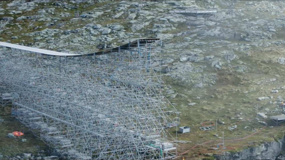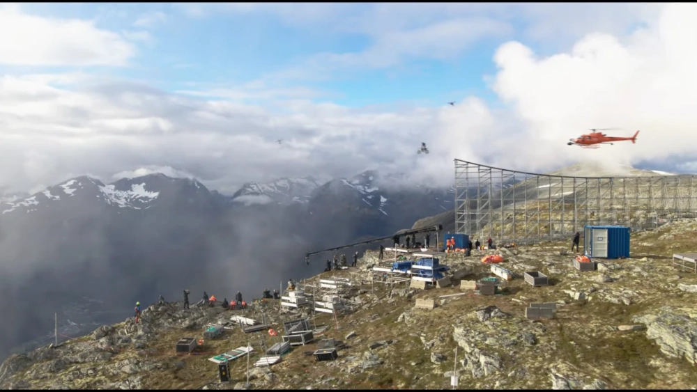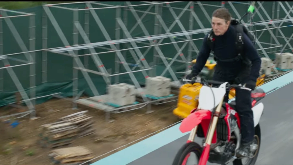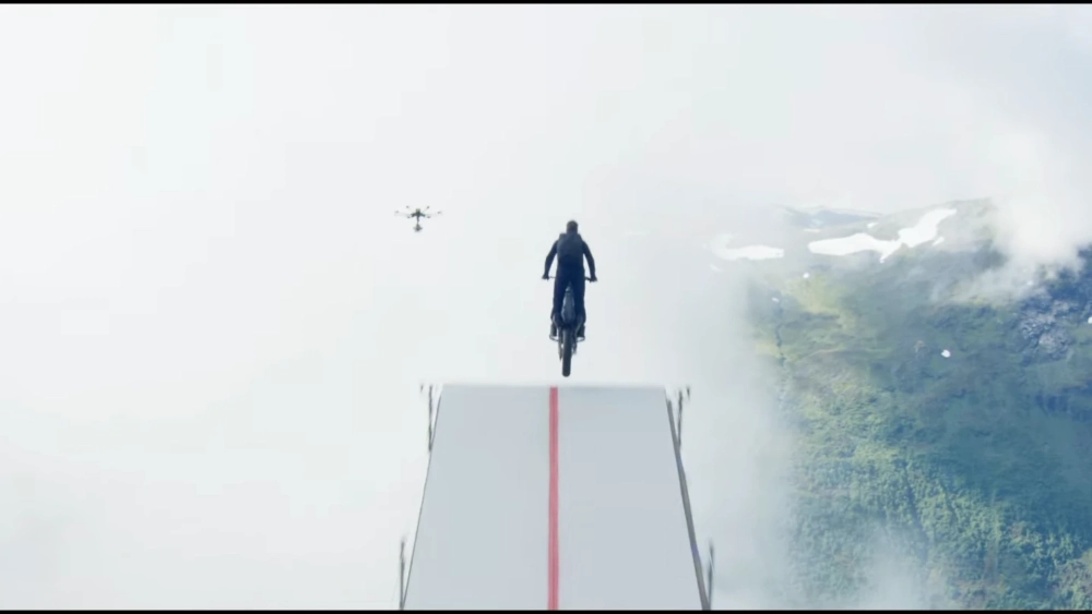 Сцена включает в себя погоню на мотоцикле, которая заканчивается прыжком со скалы в Хеллесильте, Норвегия. Трюк готовили несколько лет: Круз обучался прыжкам на мотоцикле на специальной трассе, а также брал курсы бейсджампинга и выполнял десятки прыжков с парашютом в день — за всё время подготовки набралось 500 таких прыжков.