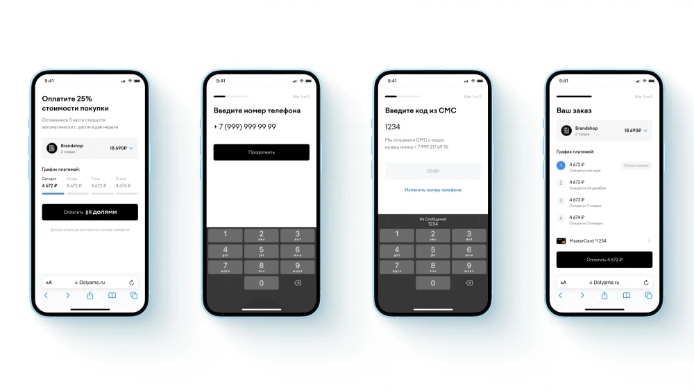 Чтобы воспользоваться сервисом «Долями», нужно сказать об этом кассиру и отсканировать специальный QR-код. Откроется веб-страница со списком покупок, стоимостью и графиком платежей. Зарегистрированным пользователям или клиентам «Тинькофф» останется только подтвердить номер телефона кодом из СМС, а остальным клиентам — указать ФИО, дату рождения и адрес электронной почты.