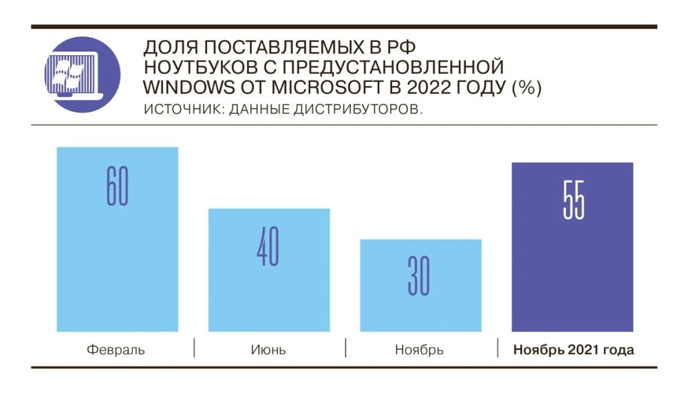 Доля поставляемых в Россию ноутбуков с предустановленной ОС Windows к ноябрю 2022 года составила 30%. Об этом свидетельствуют данные газеты «Коммерсантъ», полученные от дистрибьюторов техники.