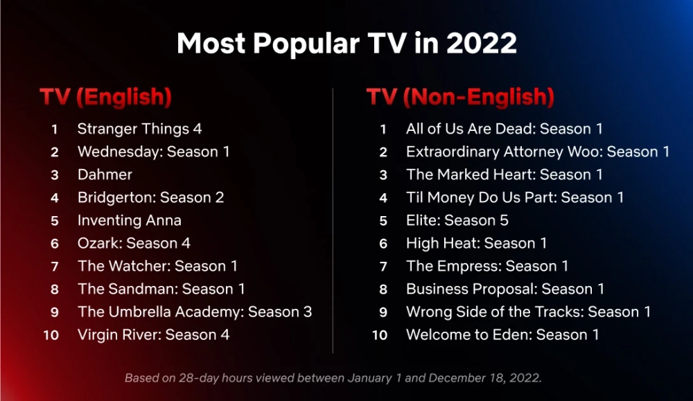Четвёртый сезон «Очень странных дел» (1,35 млрд часов за первые 28 дней) и «Уэнсдей» (1,237 млрд часов за первые 28 дней) возглавляют топ-10 англоязычных сериалов.