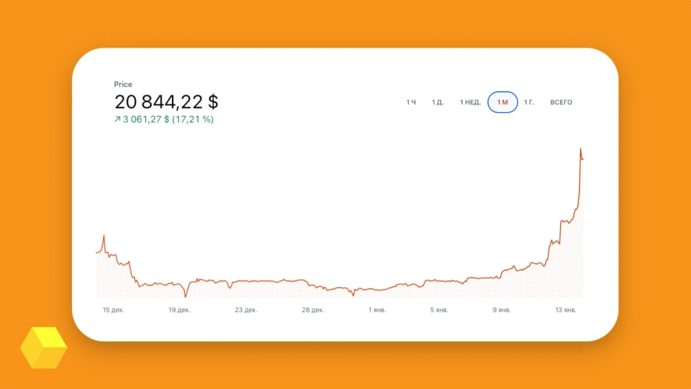 Стоимость монеты Bitcoin превышала утром 14 января отметку в 21 000 долларов, на момент написания материала составляет 20 800 долларов. Таких значений валюта не достигала с 8 ноября 2022 года.