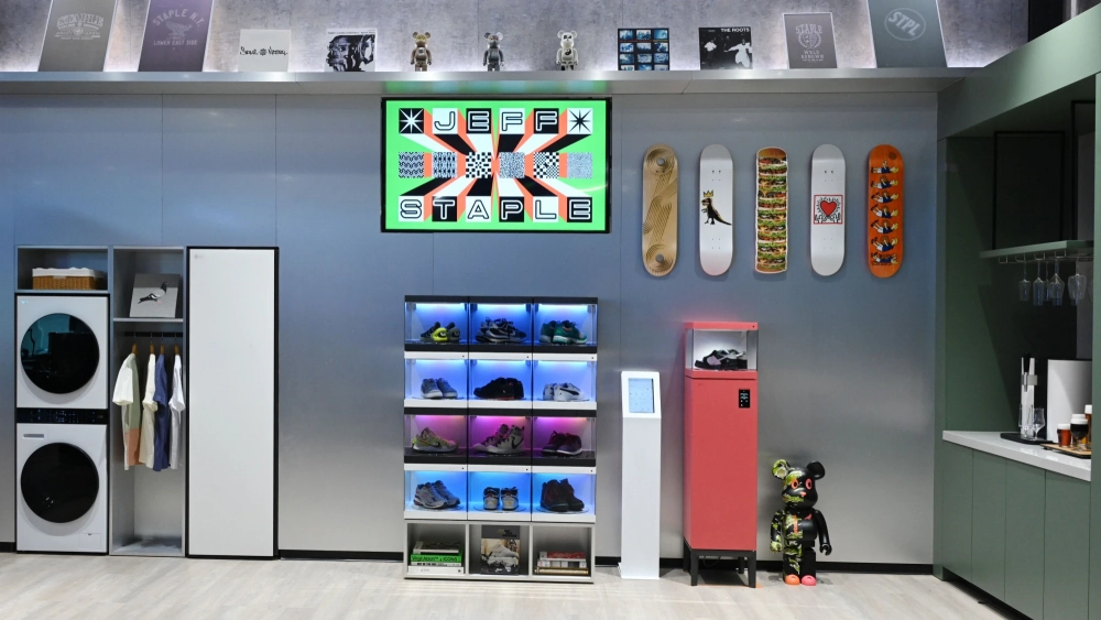 LG также начала сотрудничество с дизайнером Джеффом Стейплом, известным своим брендом одежды Staple. В рамках коллаборации показали двухрядный обувной шкаф LG Styler ShoeCase для хранения и ухода за обувью.