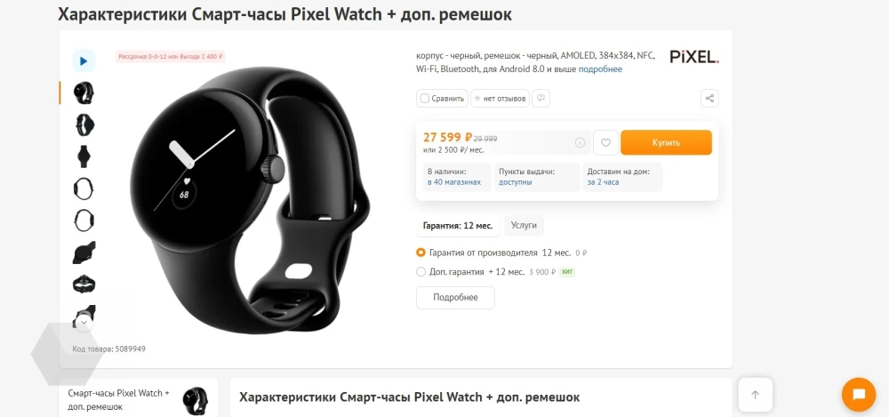 Стоимость часов на сайте DNS — 27 599 рублей. В рознице — 29 999 рублей. На момент написания новости в интернет-магазине сети на устройство действует скидка 2400 рублей. Для сравнения, цена Pixel Watch в США — 349 долларов (~24 000 рублей).