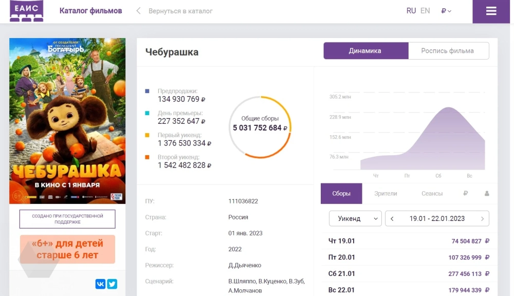 «Чебурашка» стал первым фильмом в истории кинопроката России, собравшим более 5 миллиардов рублей