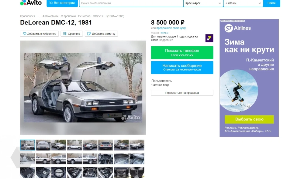В объявлении сказано, что это «полностью оригинальный автомобиль в отличном состоянии и без пробега по России». В авто стоит мотор 2,8 л с мощностью 150 л.с. Стоимость DeLorean DMC-12 — 8,5 млн рублей. Судя по объявлению, продавец находится в Красноярске.