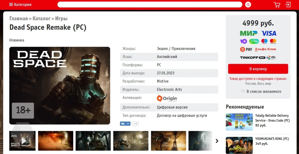 Издательство «Бука» запустило в продажу Origin-ключи ремейка Dead Space для ПК. Активировать ключ можно в любом регионе, включая Россию, говорится в описании товара.