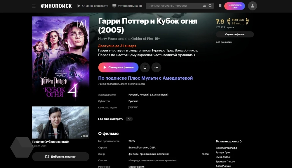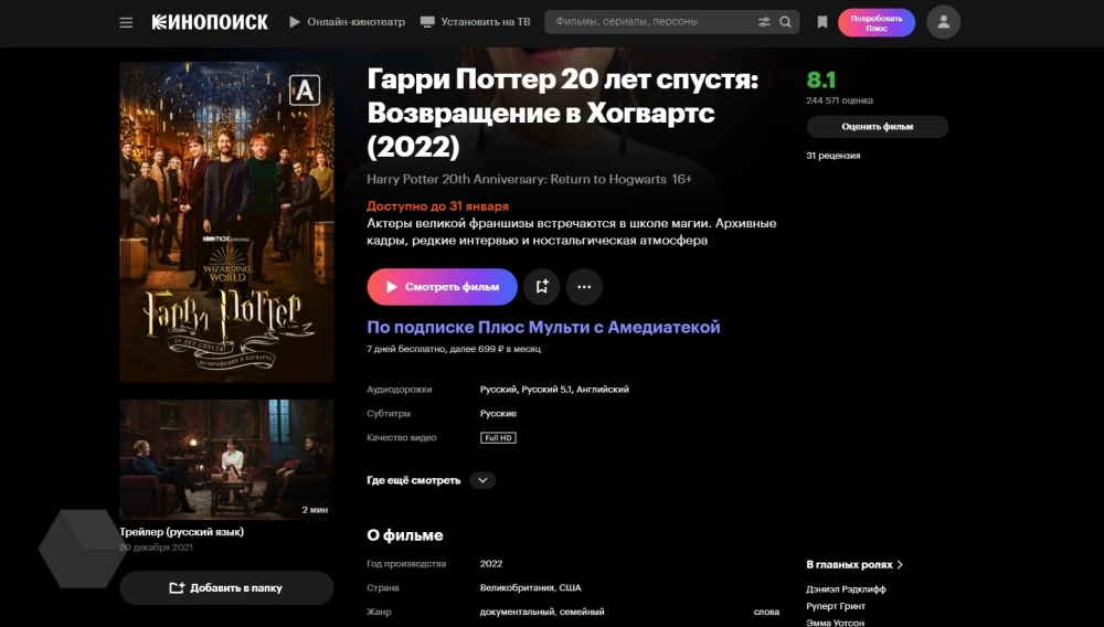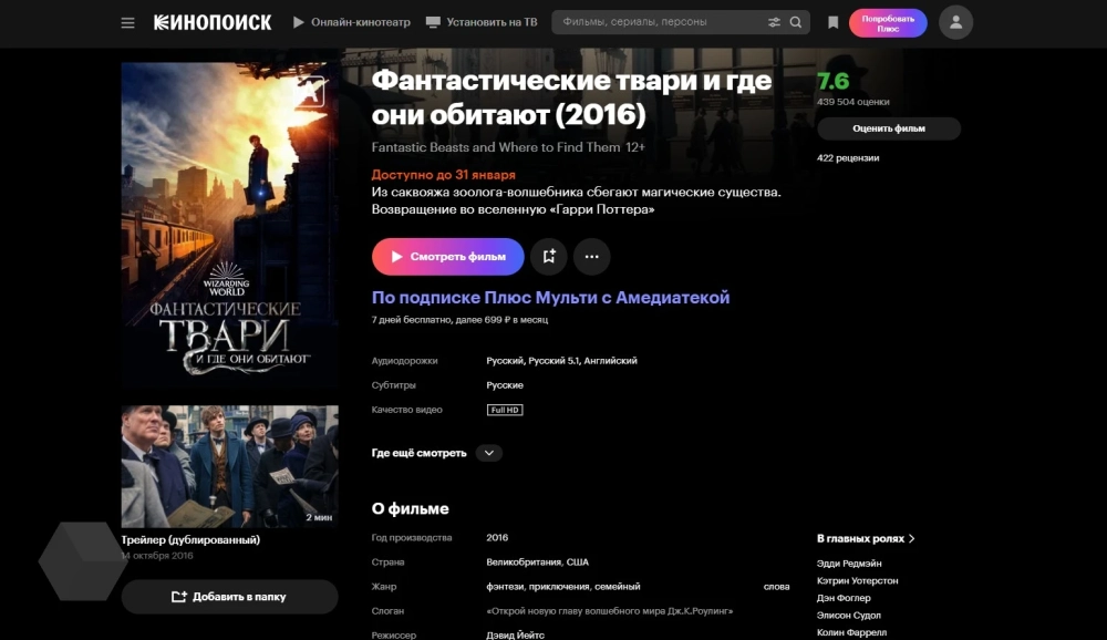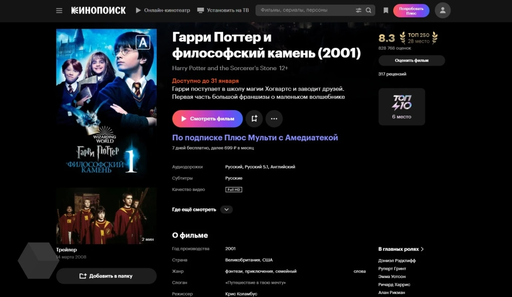 На сайте онлайн-кинотеатра «Кинопоиск» сказано, что все части «Гарри Поттера» и «Фантастических тварей» будут доступны подписчикам «Плюса» с «Амедиатекой» лишь до 31 января 2023 года.