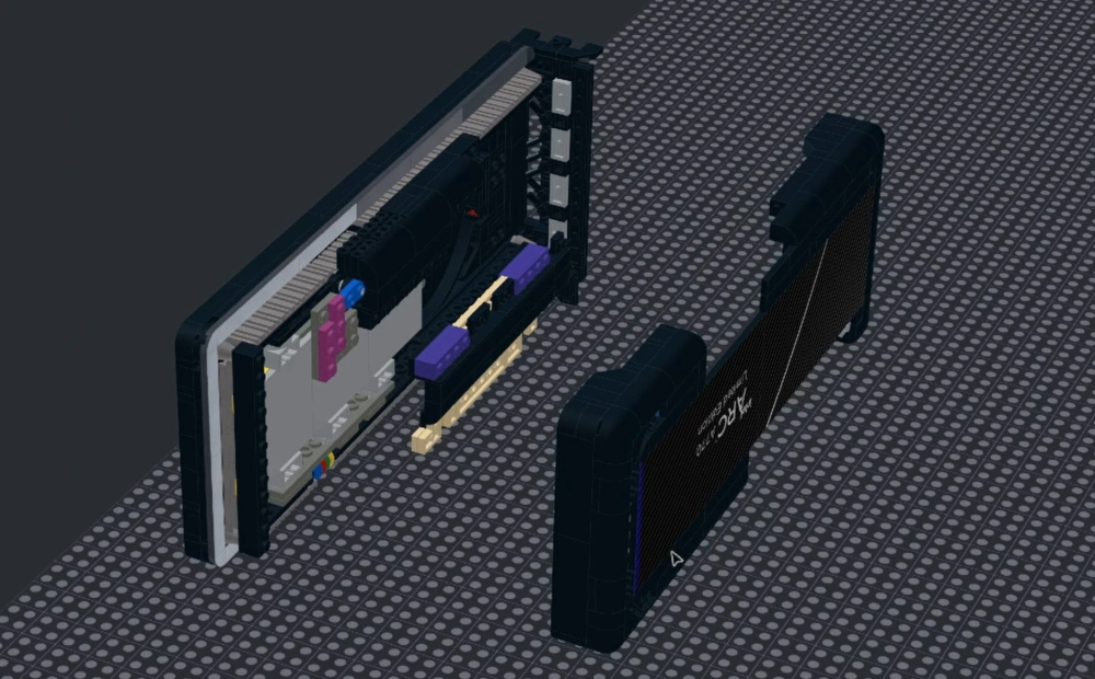 Копия выполнена в размере 1:1 к оригинальной Arc A750 и включает все внутренние компоненты настоящей видеокарты. Хилл даже подумывал сделать светодиодную подсветку — у LEGO есть несколько комплектов с освещением — но для них просто не хватило места при сохранении масштаба.