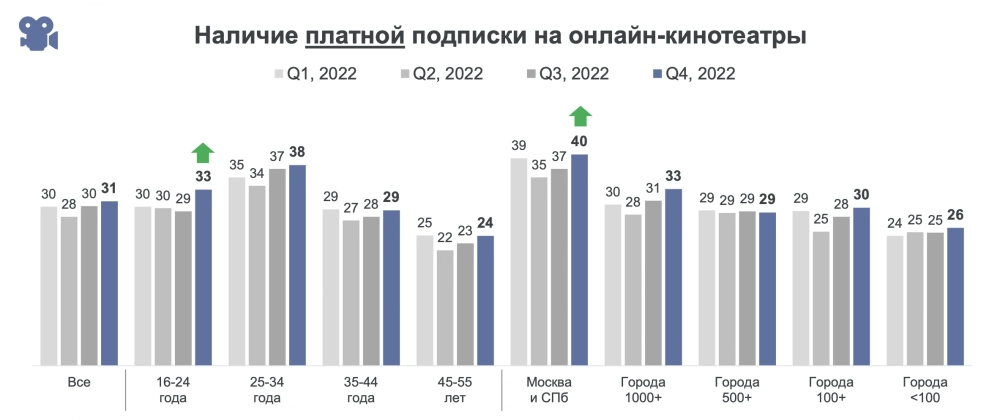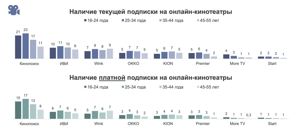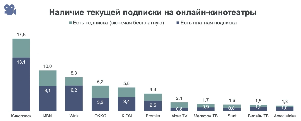 У 46% горожан была оформлена подписка на онлайн-кинотеатры — включая платную и бесплатную. Платная подписка — у 31% горожан. Лидером по количеству подписчиков (платных и бесплатных) остаётся «Кинопоиск» — подпиской пользовались 17,8% жителей городов от 16 до 55 лет, а 13,1% пользовались платной подпиской.