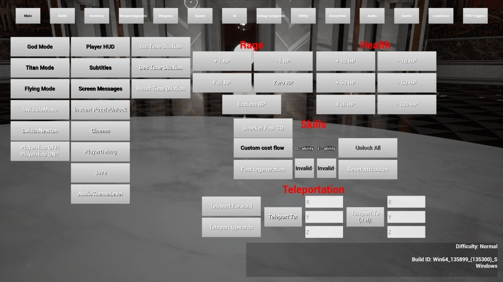 - В слитом билде есть несколько отладочных меню, одно из них позволяет перемещаться по точкам сюжета;