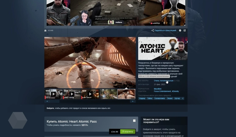 Atomic Heart вышла на всех платформах, включая магазин Steam, где новинка уже собирает первые отзывы. В целом, геймеры положительно оценили шутер. На момент написания новости у игры более 1100 отзывов и 88% из них — положительные.