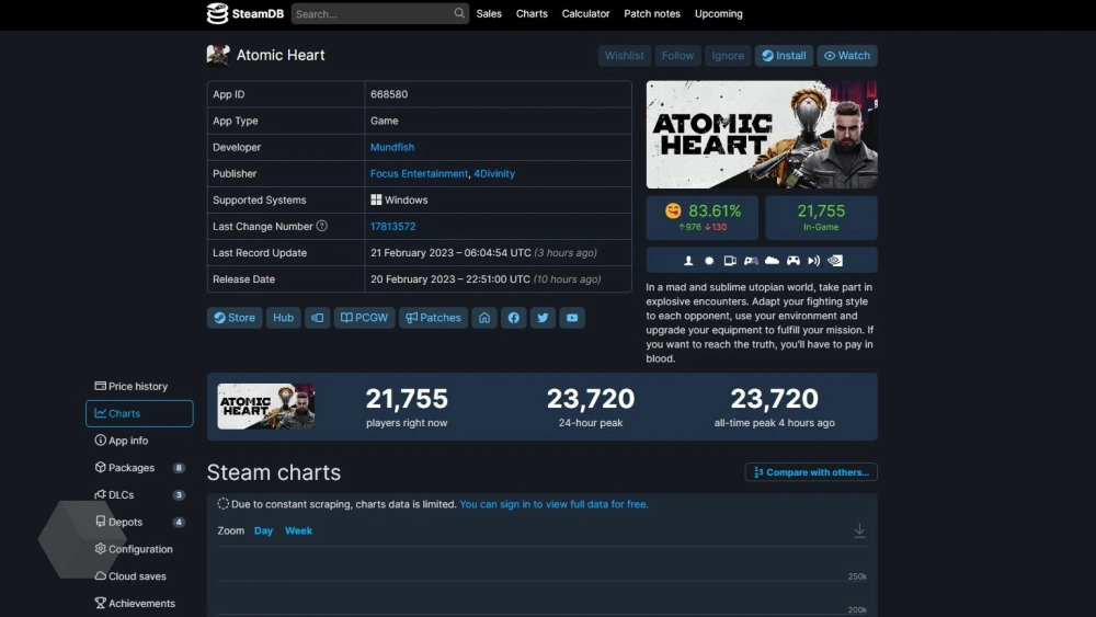 Что касается пикового онлайна, пока он составляет 23 720 игроков. Может показаться, что это не так много, особенно на фоне Hogwarts Legacy с её почти 900 000 одновременно играющих пользователей. Однако, если сравнивать, к примеру, с ремейком Dead Space (30 925 игроков) или The Callisto Protocol (17 580 игроков), то показатели у игры Mundfish весьма достойные.