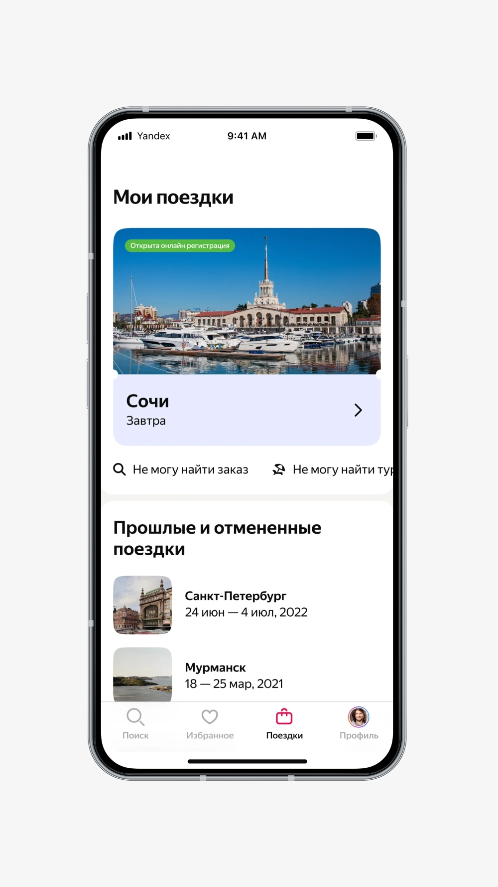 В приложении есть вкладка «Поездки» — в ней собрана вся информация о ближайшем путешествии. На одном экране можно увидеть билеты, рекомендации мероприятий из «Яндекс Афиши» и даже погоду в месте, куда пользователь запланировал путешествие.