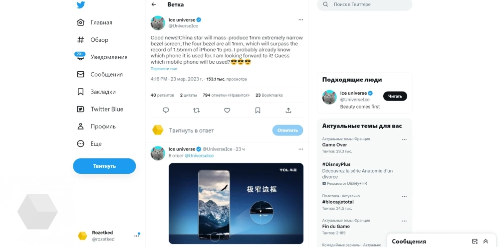 К разработке таких панелей, судя по всему, приложила руку компания TCL. При этом речь идёт не о какой-то одной рамке, а о всех четырёх. Ice Universe напомнил, что у iPhone 15 Pro, по слухам, рамки дисплея будут иметь толщину 1,55 мм. Таким образом, грядущий китайский смартфон (или смартфоны) превзойдёт в этом плане новый аппарат Apple.