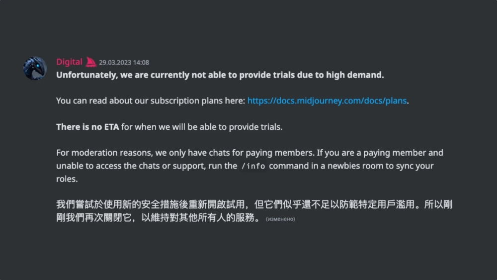 Хольц предположил, что всплеск спроса мог возникнуть из-за завирусившегося в Китае видео с обучением работе с Midjourney. Одновременно с этим компания столкнулась с временной нехваткой графических процессоров.