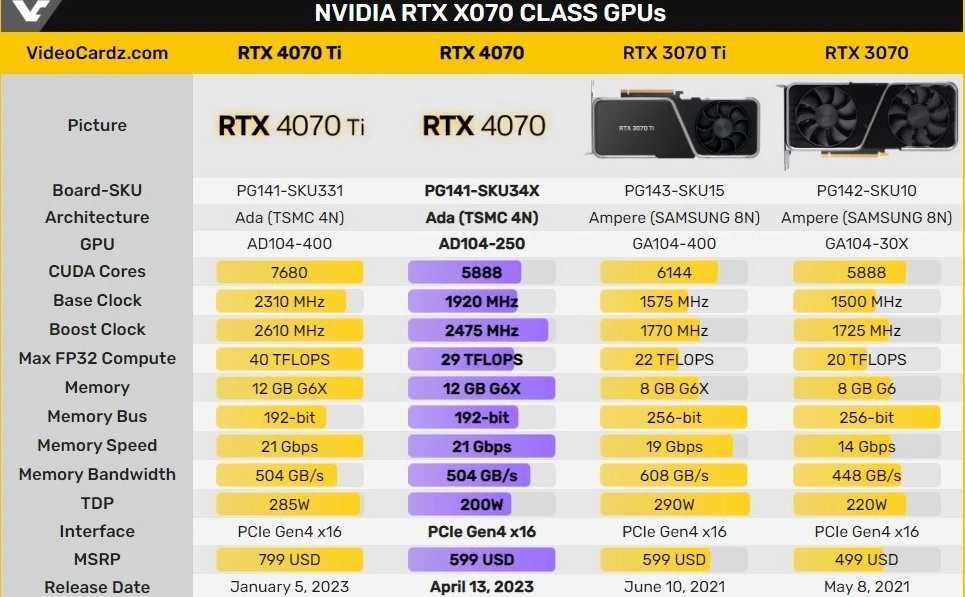 Карточка базируется на чипе AD104. На попавшем в сеть слайде не указано количество ядер CUDA, но известно, что их будет 5888. Новое решение получило 36 МБ кэш-памяти L2 (4070 Ti имеет 48 МБ).